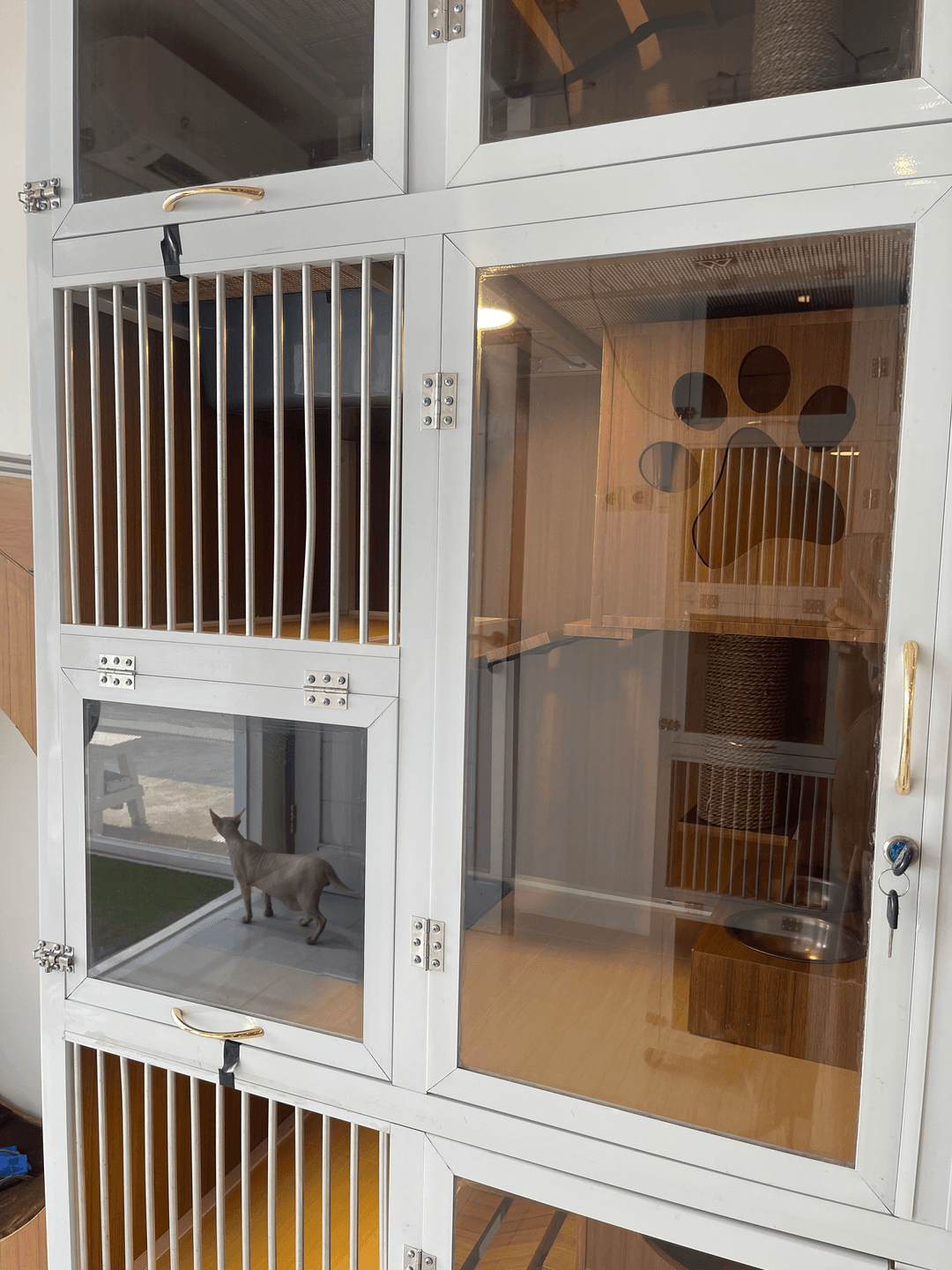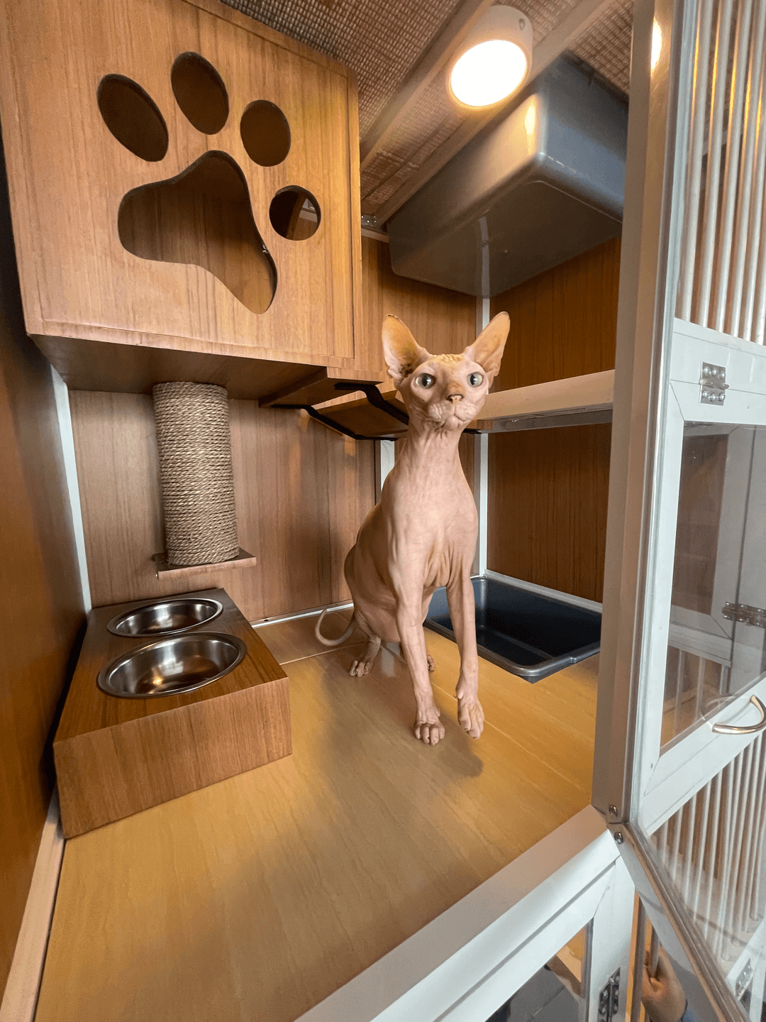 Cat room yang luas dengan terdapat-nya cakaran kucing, mezanine floor, dan area hiding spot untuk kucing bersantai.