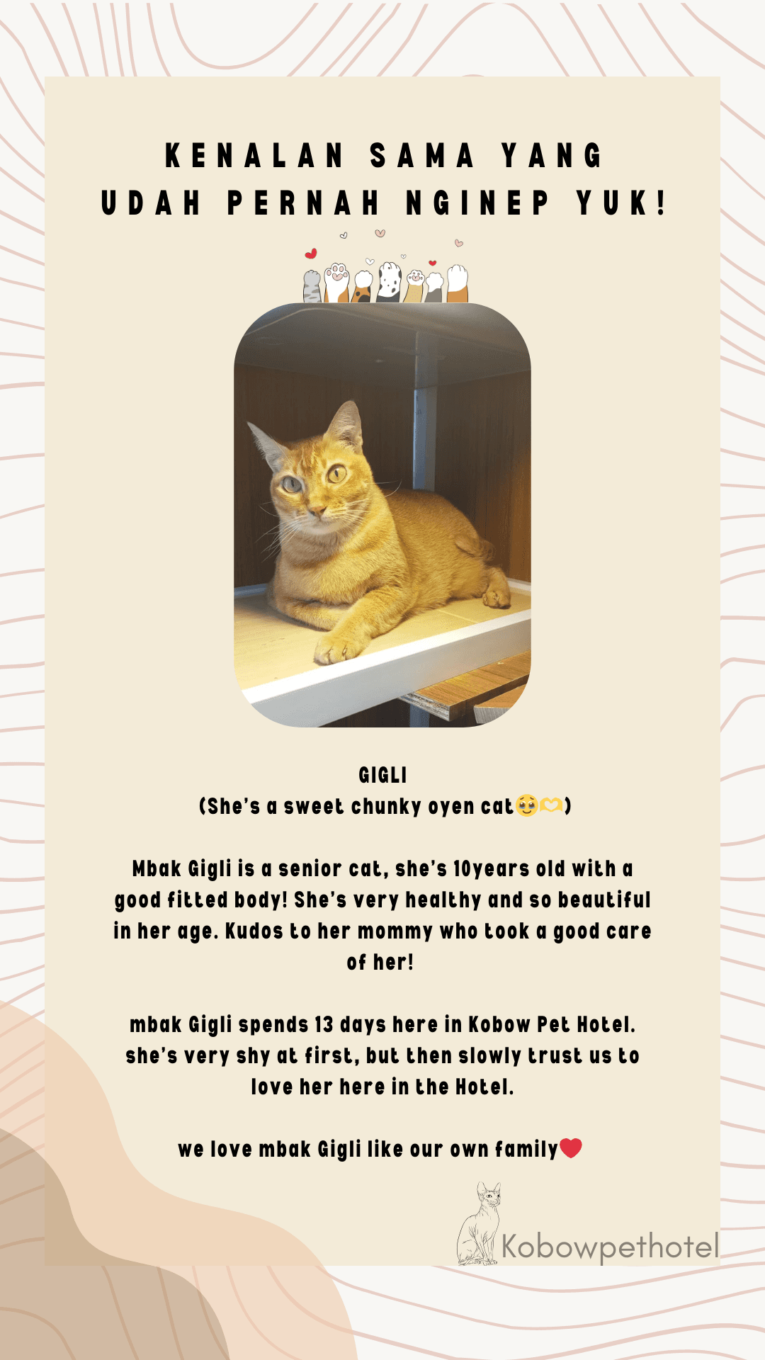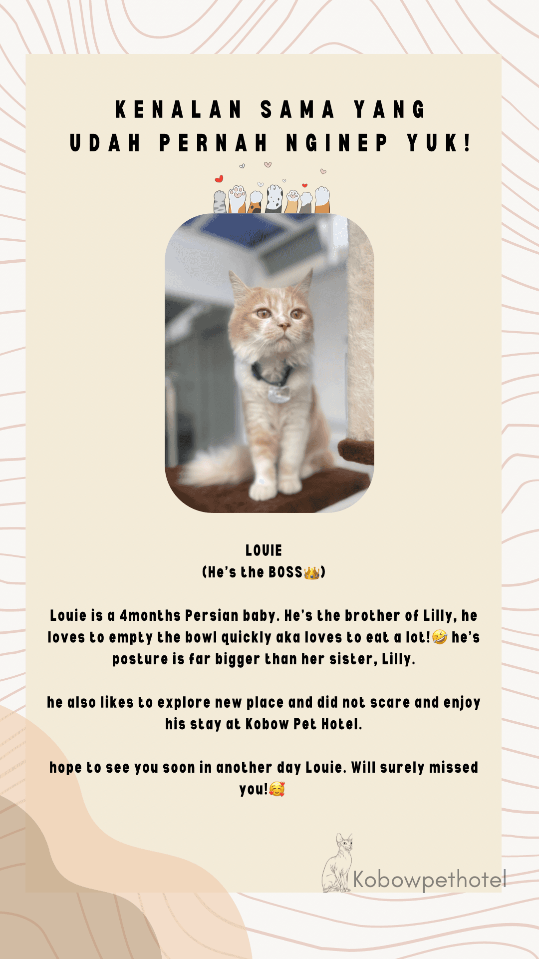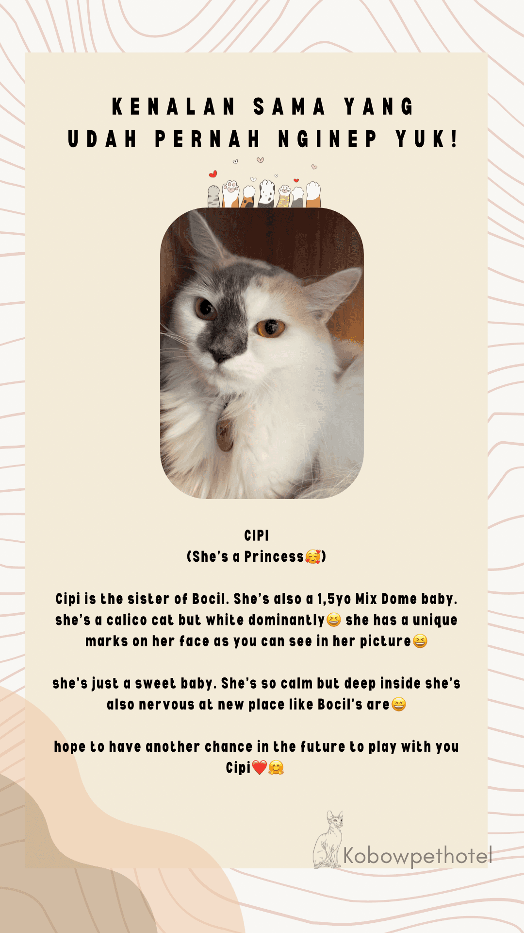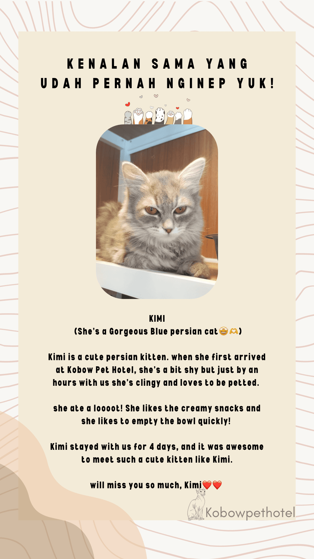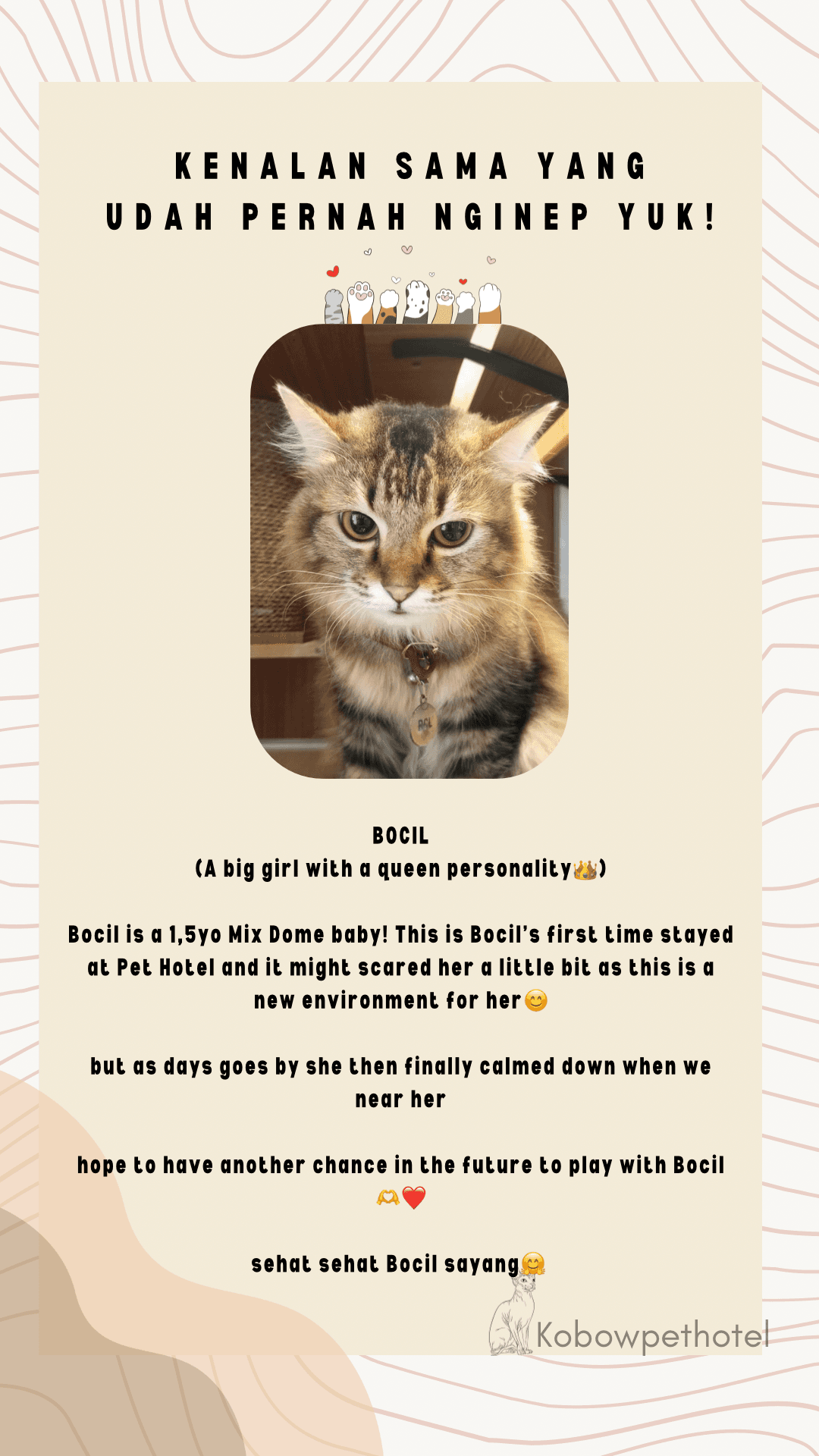 Karakter tiap kucing ketika menginap di Pet Hotel tidak semua sama. Ada yang happy, ada yang baik-baik saja, sampai ada yang sedih banget ketika ditinggal sementara waktu sama Pawrents nya. Ini challenges kami sebagai cat keeper untuk sebisa mungkin membuat para anabul nyaman dan yang paling penting membuat mereka mau makan dan tidak stress. Juga membuat para Pawrents tenang saat berjauhan dengan anabul mereka. Kami sebagai Pet Hotel / Cat keeper mencoba memahami karakter semua kucing yang menginap di Kobow Pet Hotel agar mereka merasa bahagia seperti dirumah-nya sendiri.
