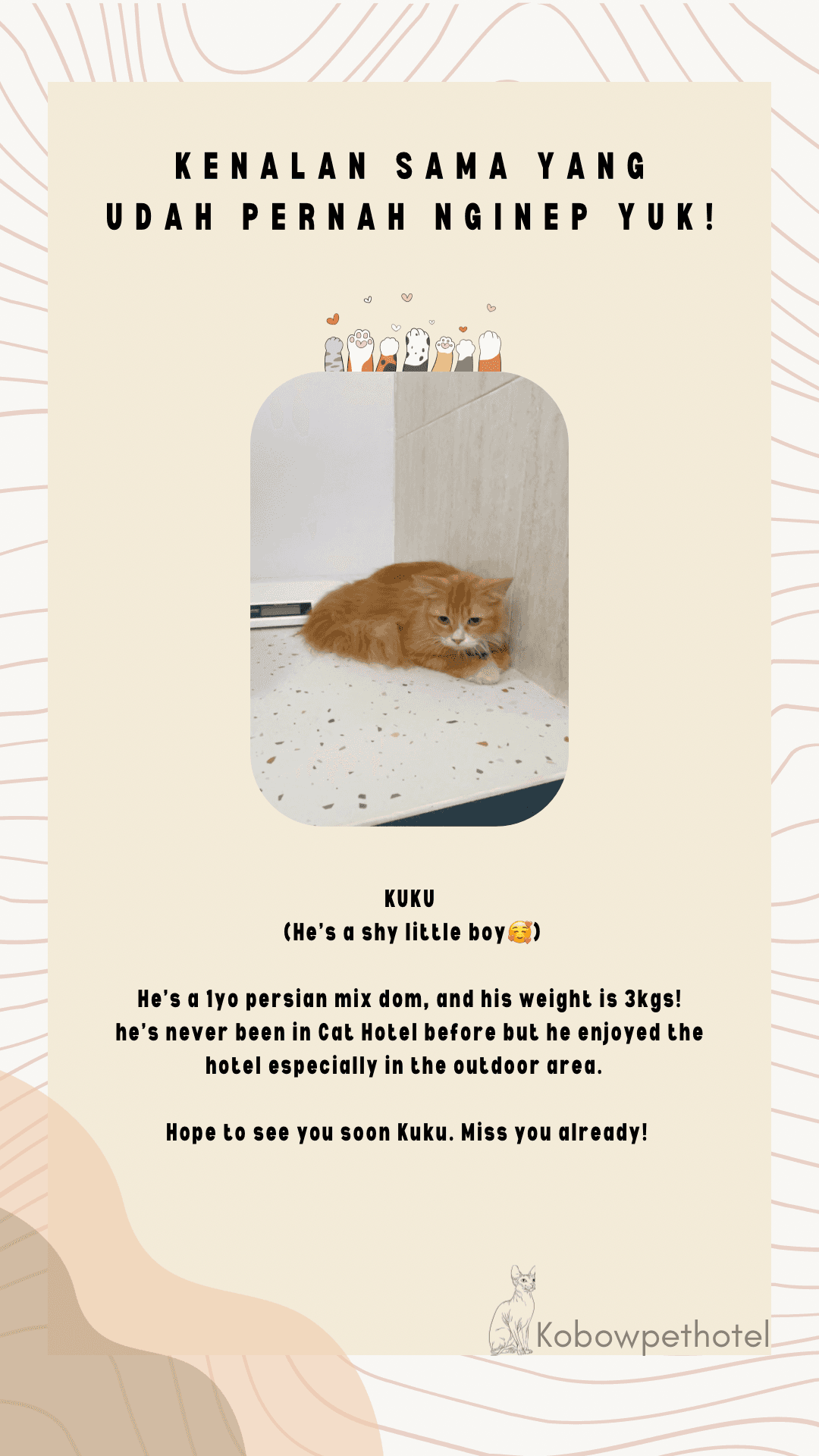 Kucing-kucing yang menginap di Pet Hotel dimanjakan dengan cat room pribadi yang luas, mendapatkan perhatian secara individual ke tiap kucing, dan juga kegiatan playtime yang menyenangkan setiap hari-nya. Transportasi antar jemput juga tersedia jika masih dalam radius 4km dari Kobow Pet Hotel.