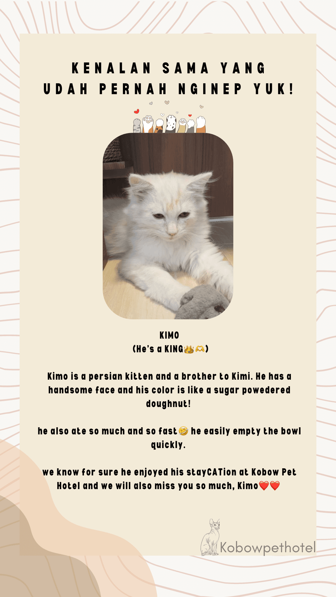 Kobow Pet Hotel adalah tempat penitipan hewan bintang 5 untuk para kucing. Berlokasi di Pondok Kopi Jakarta Timur, yang hanya berjarak 5 menit dari Gerbang Tol Bintara!