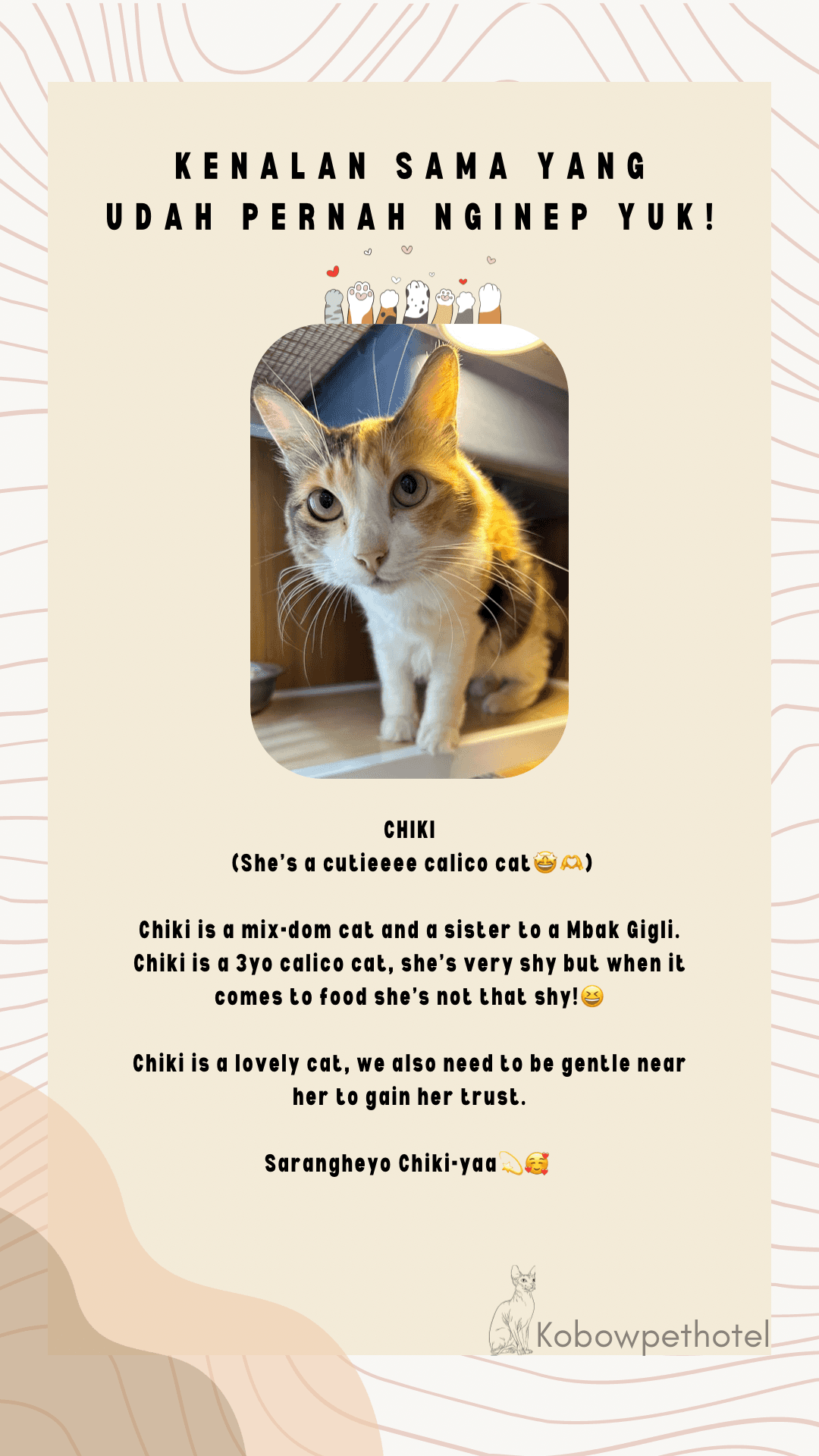 Karakter tiap kucing ketika menginap di Pet Hotel tidak semua sama. Ada yang happy, ada yang baik-baik saja, sampai ada yang sedih banget ketika ditinggal sementara waktu sama Pawrents nya. Ini challenges kami sebagai cat keeper untuk sebisa mungkin membuat para anabul nyaman dan yang paling penting membuat mereka mau makan dan tidak stress. Juga membuat para Pawrents tenang saat berjauhan dengan anabul mereka. Kami sebagai Pet Hotel / Cat keeper mencoba memahami karakter semua kucing yang menginap di Kobow Pet Hotel agar mereka merasa bahagia seperti dirumah-nya sendiri.